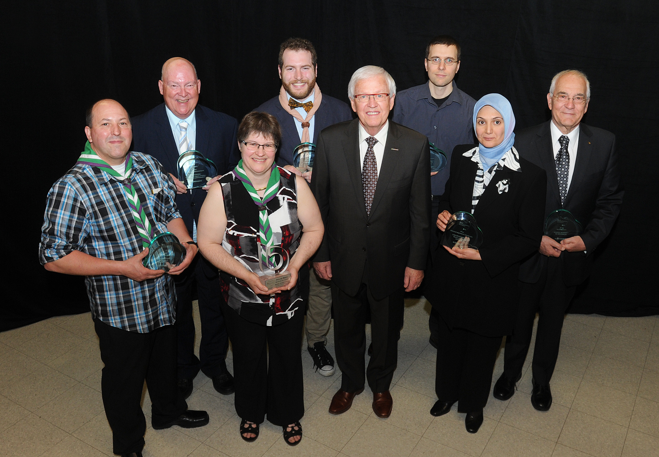 (de gauche à droite) Marc Gauthier, prix Accomplissement, Jean Cayen, prix Aîné en mouvement, Marie-Josée Ulrich, prix du Maire, Paul Leduc, maire, Jérôme Crowe, prix Jeunesse, Lina Mohammed Ali, prix Encouragement bénévole, Olivier Fabre, prix Accomplissement et Alain Wagner, représentant du Réseau Internet de Brossard pour le prix Solidaction.