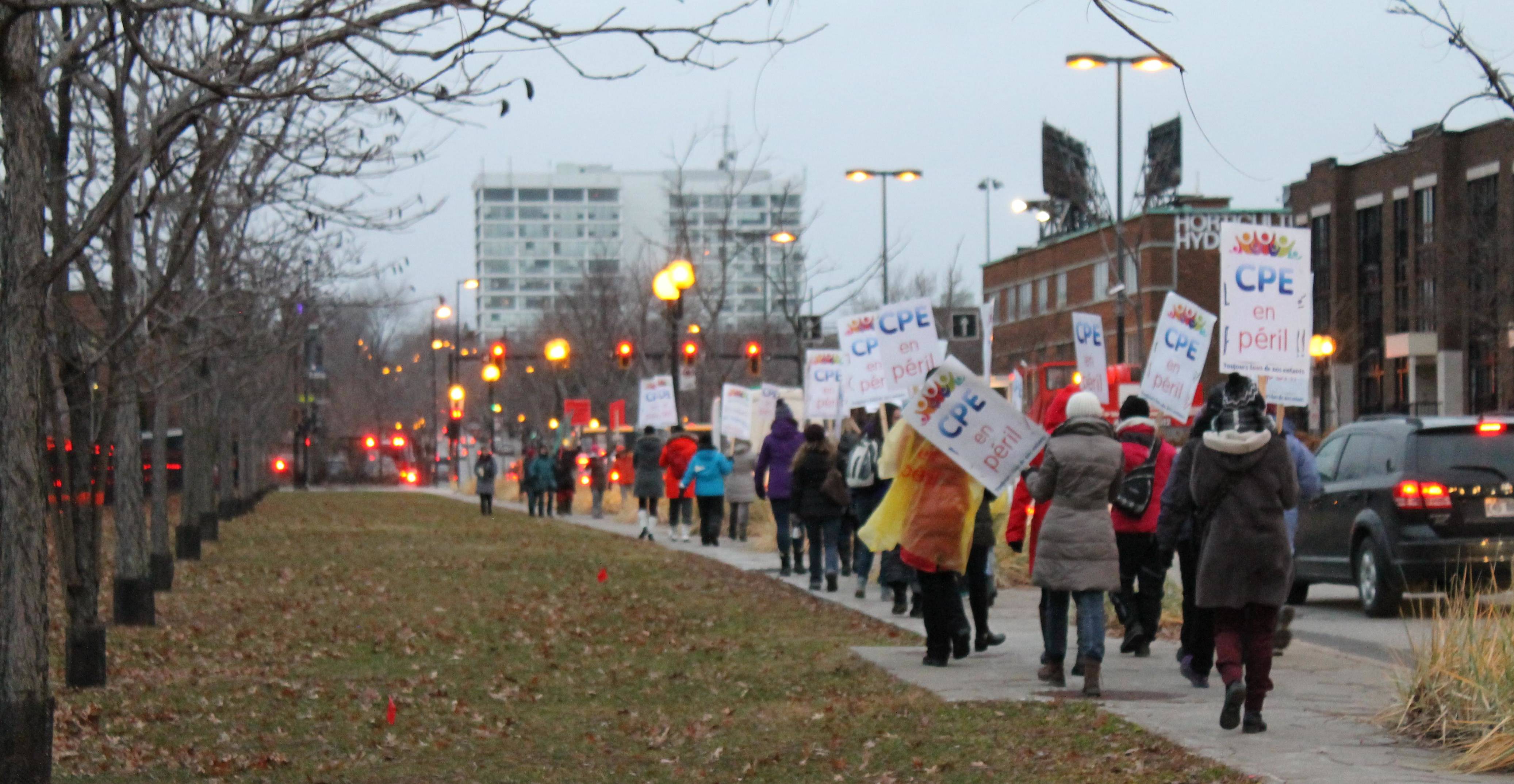 Des intervenantes en CPE ont manifesté mercredi matin au pied du pont Jacques-Cartier.